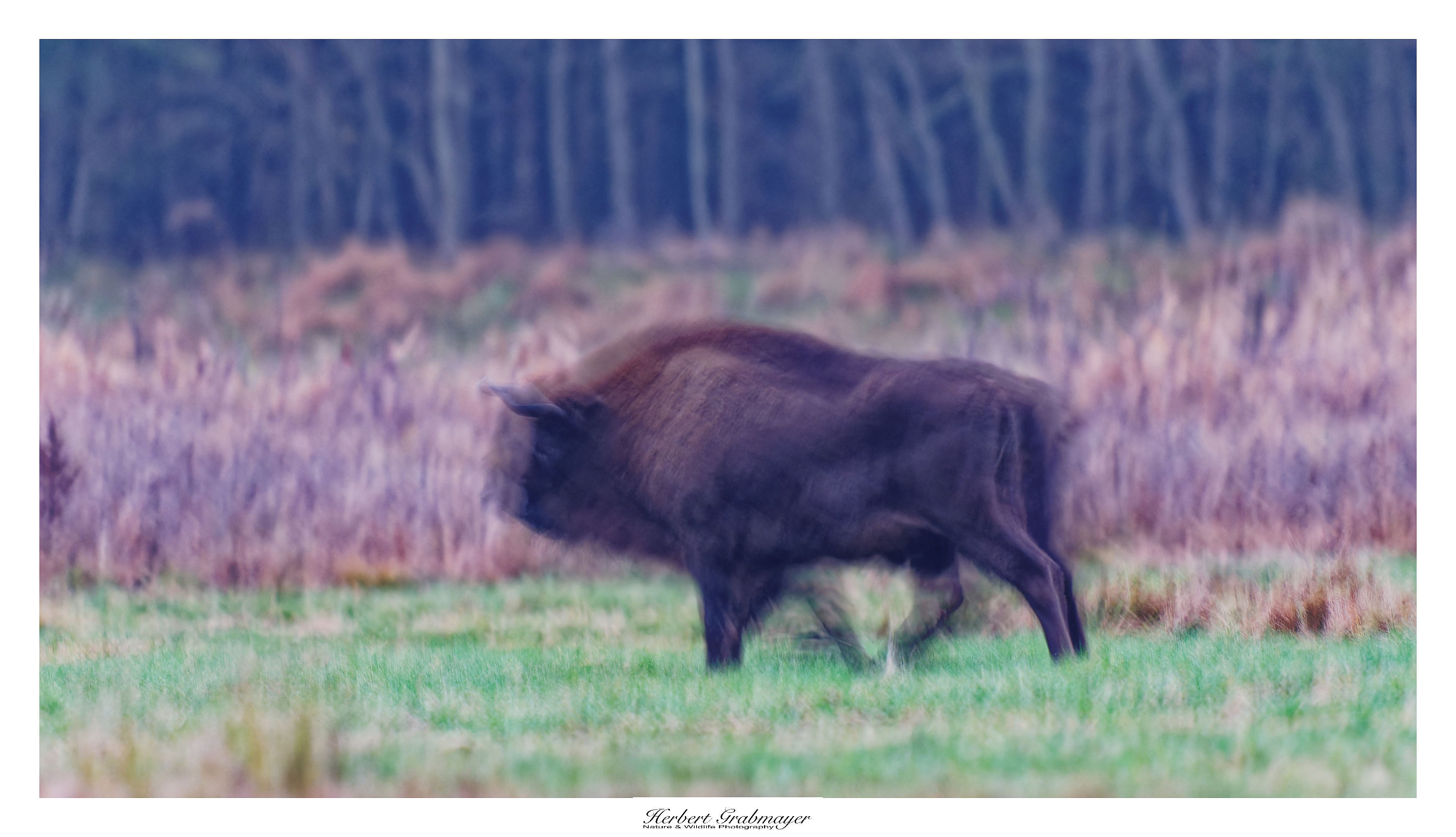 Grenzzaun und Wisent im Regen zwischen Lesna und Siemianowka