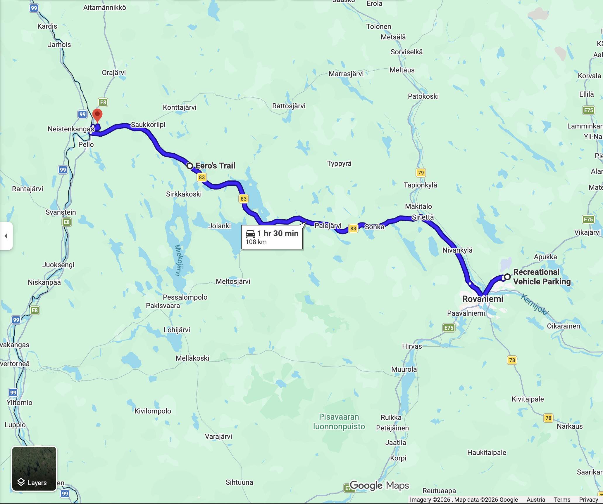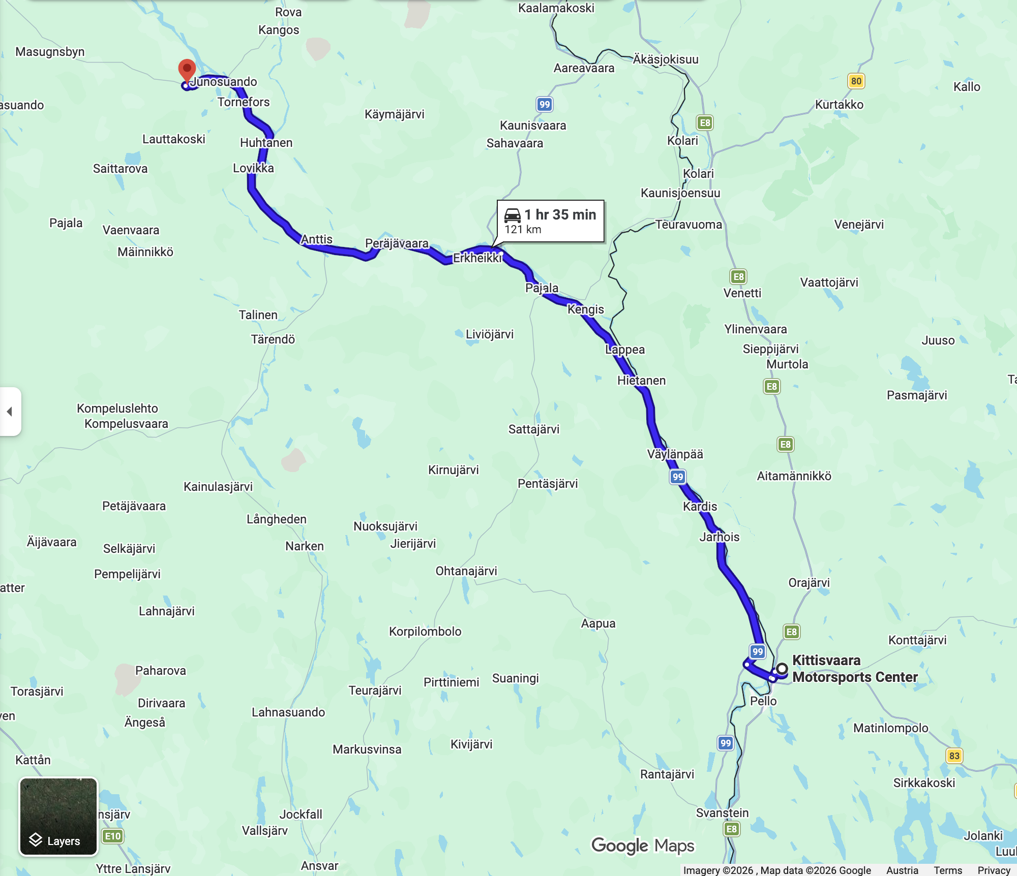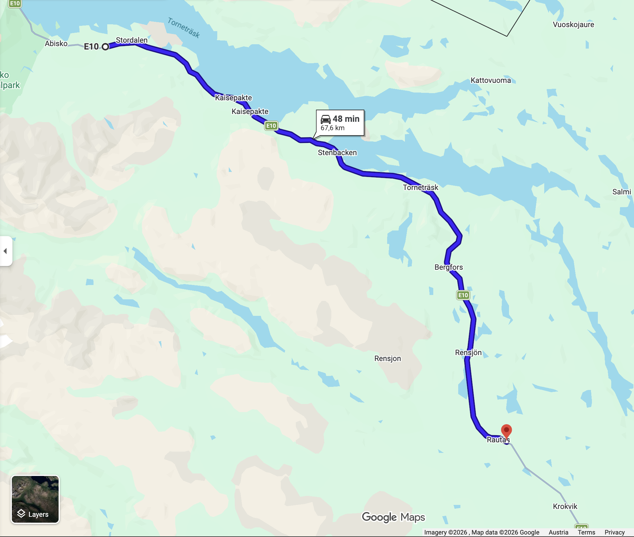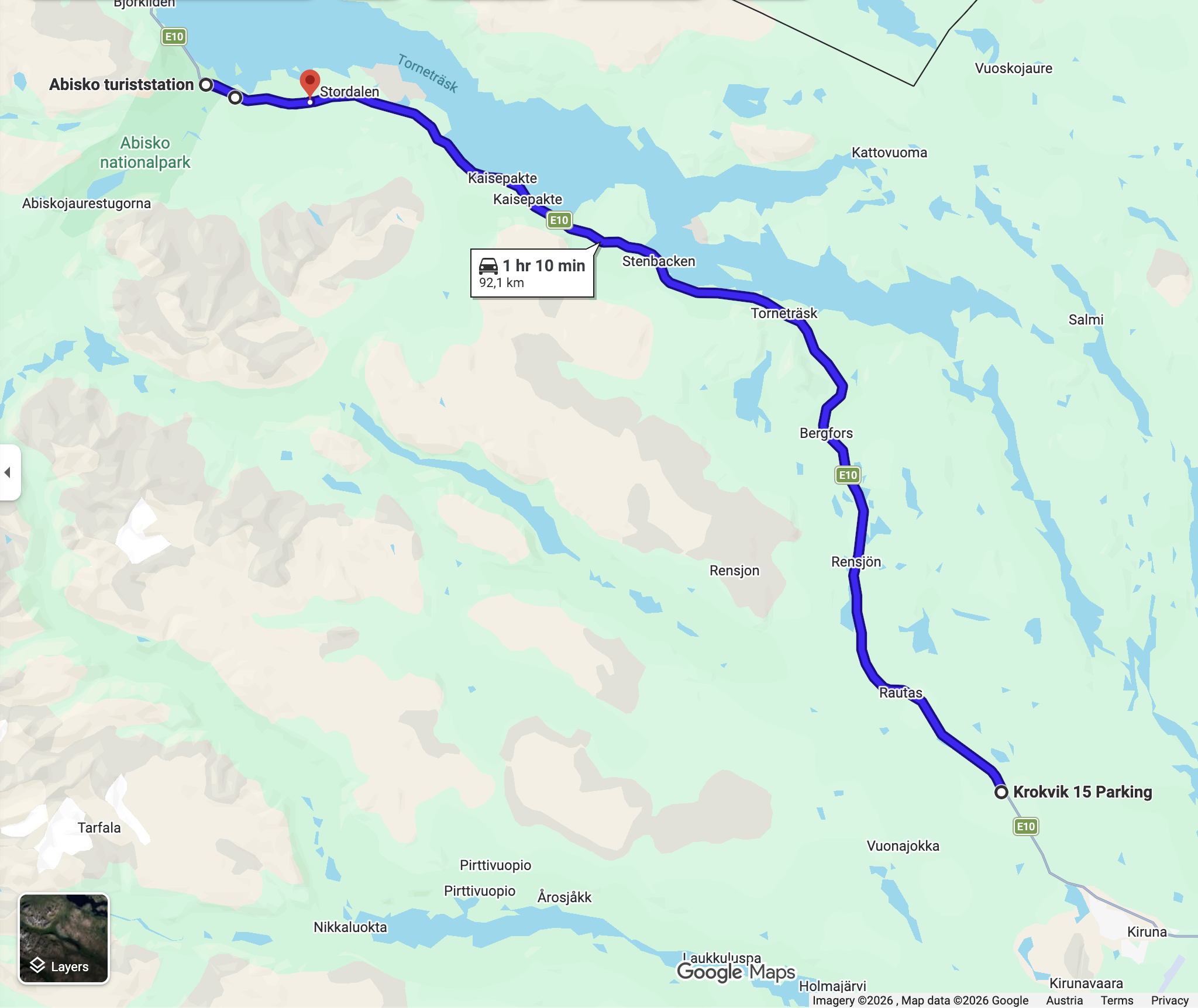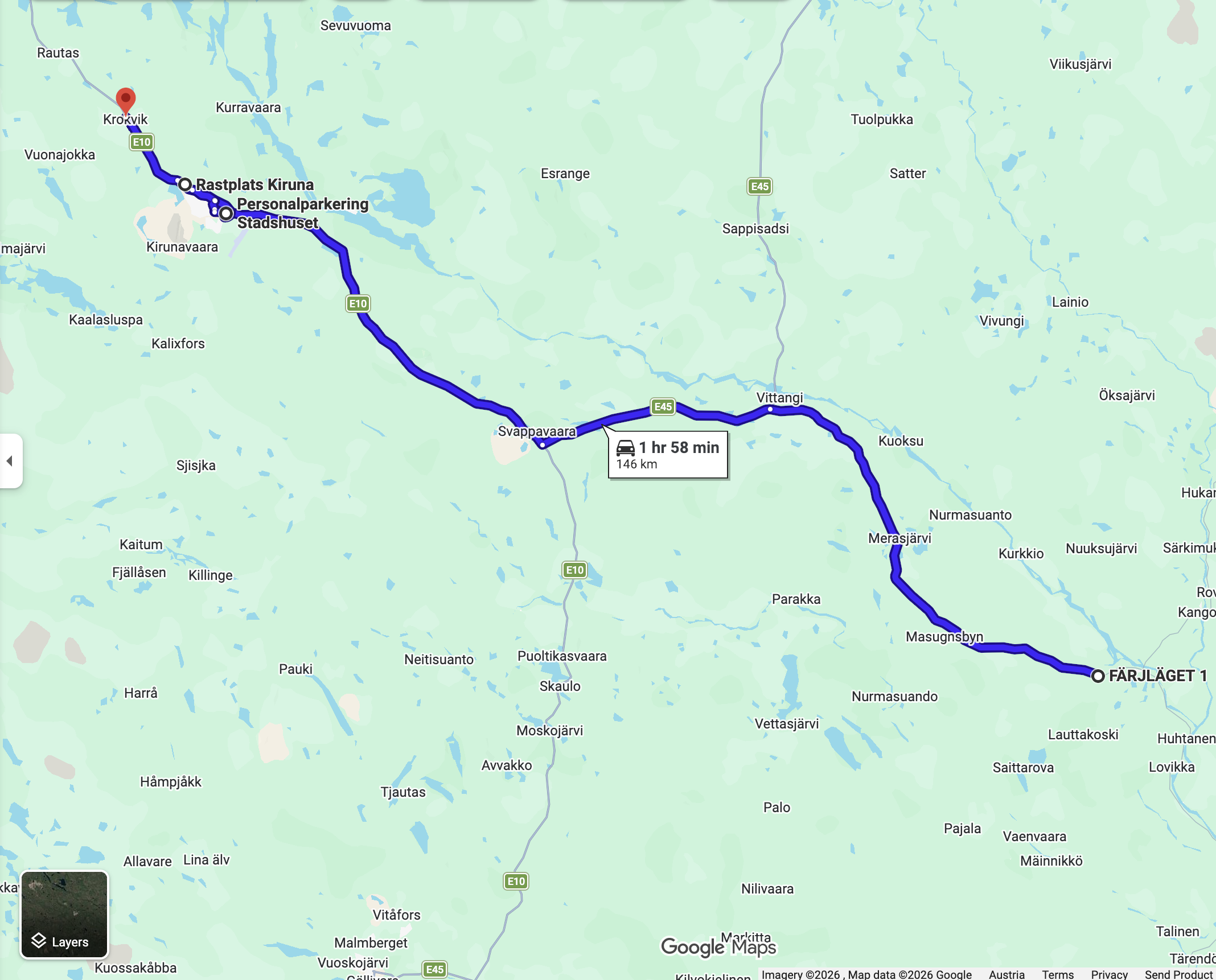 146 km nach Kiruna. Die Strecke ist gut ausgebaut. Wird ja auch von den Schwerlkw benutzt. Wen man mit 80 - 90 km/h unterwegs ist läuft man auf keinem auf und es sitzt einem auch keiner im Nacken.