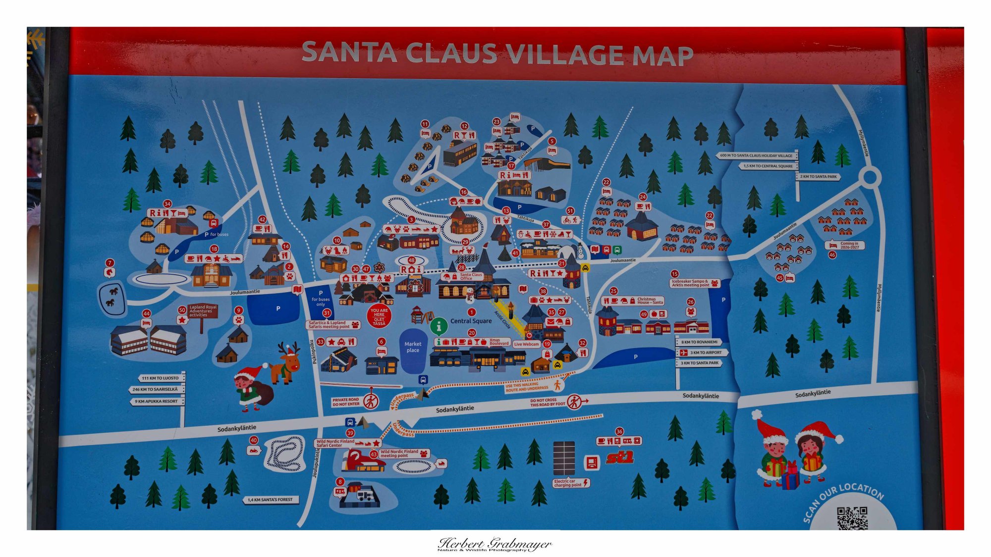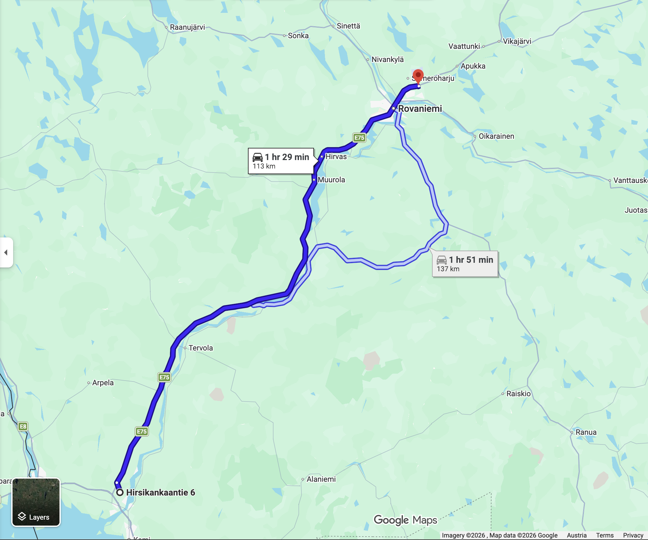 113 km auf der E75 über Rovaniemi zum Weihnachtsmanndorf und Polarkreis. Straße war wieder eine normale Bundesstraße.