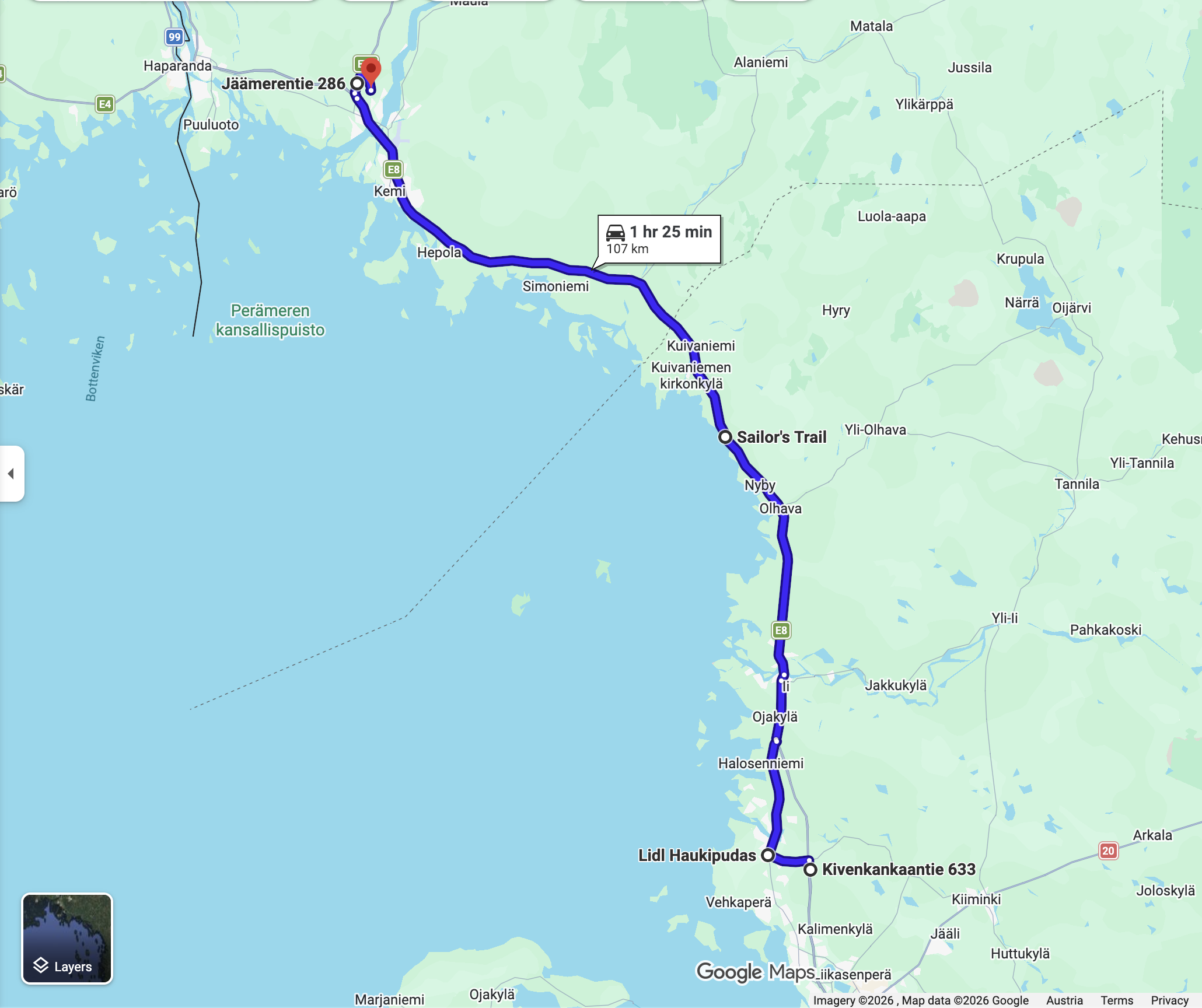107 km Richtung Norden E8/E75 ist teilweise 4 spurig, teilweise mit Gegenverkehr 1 spurig / 2 spurig ausgelegt.