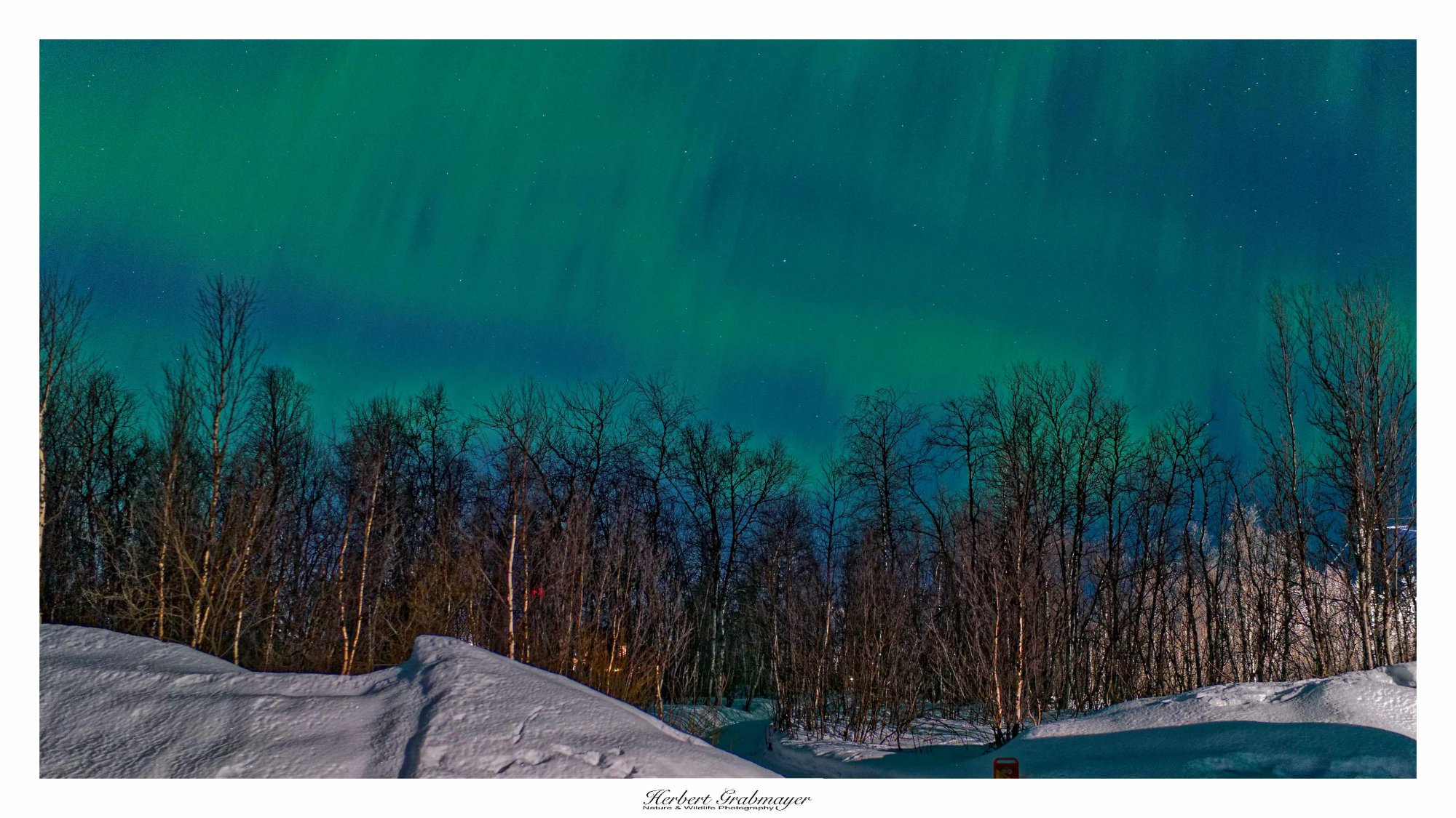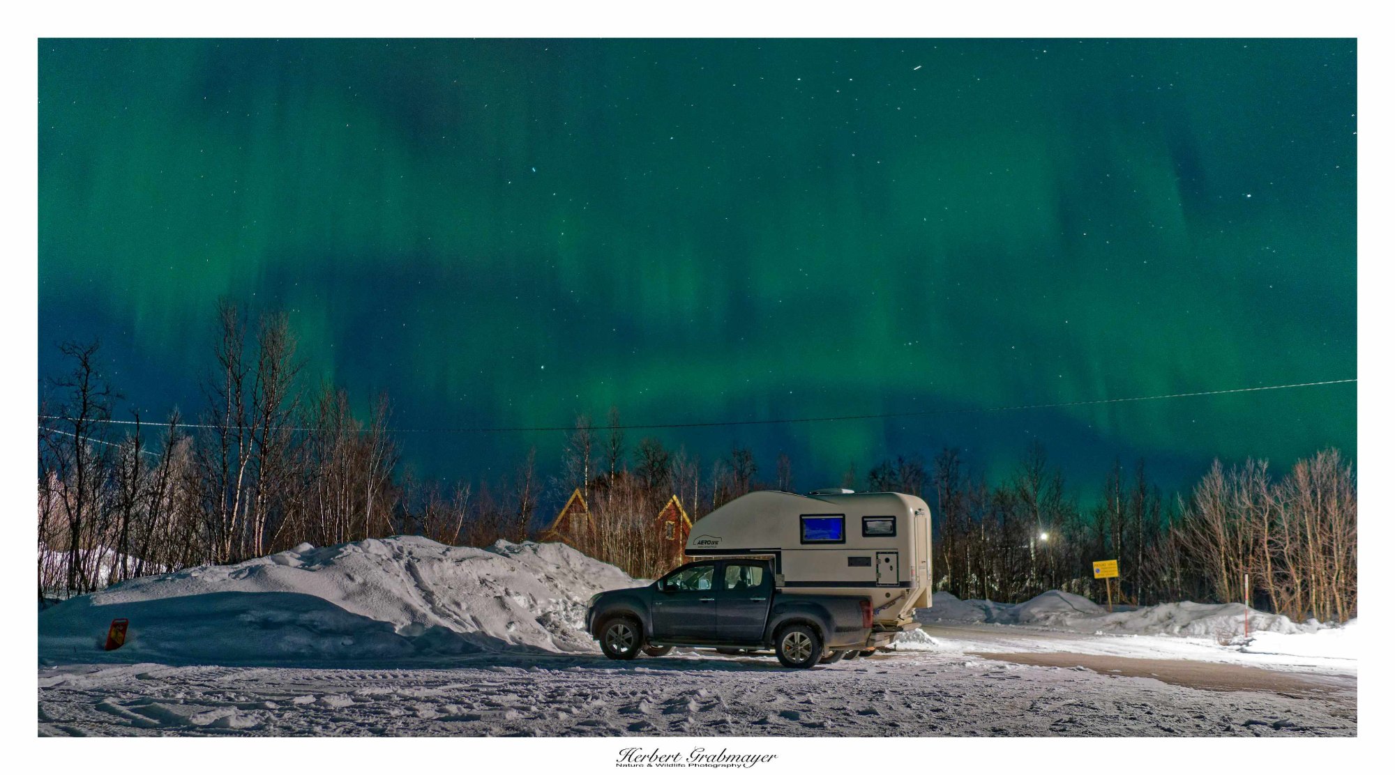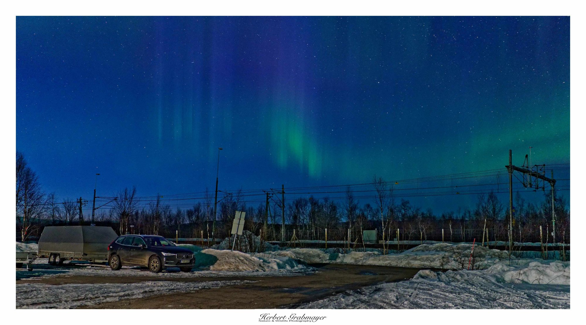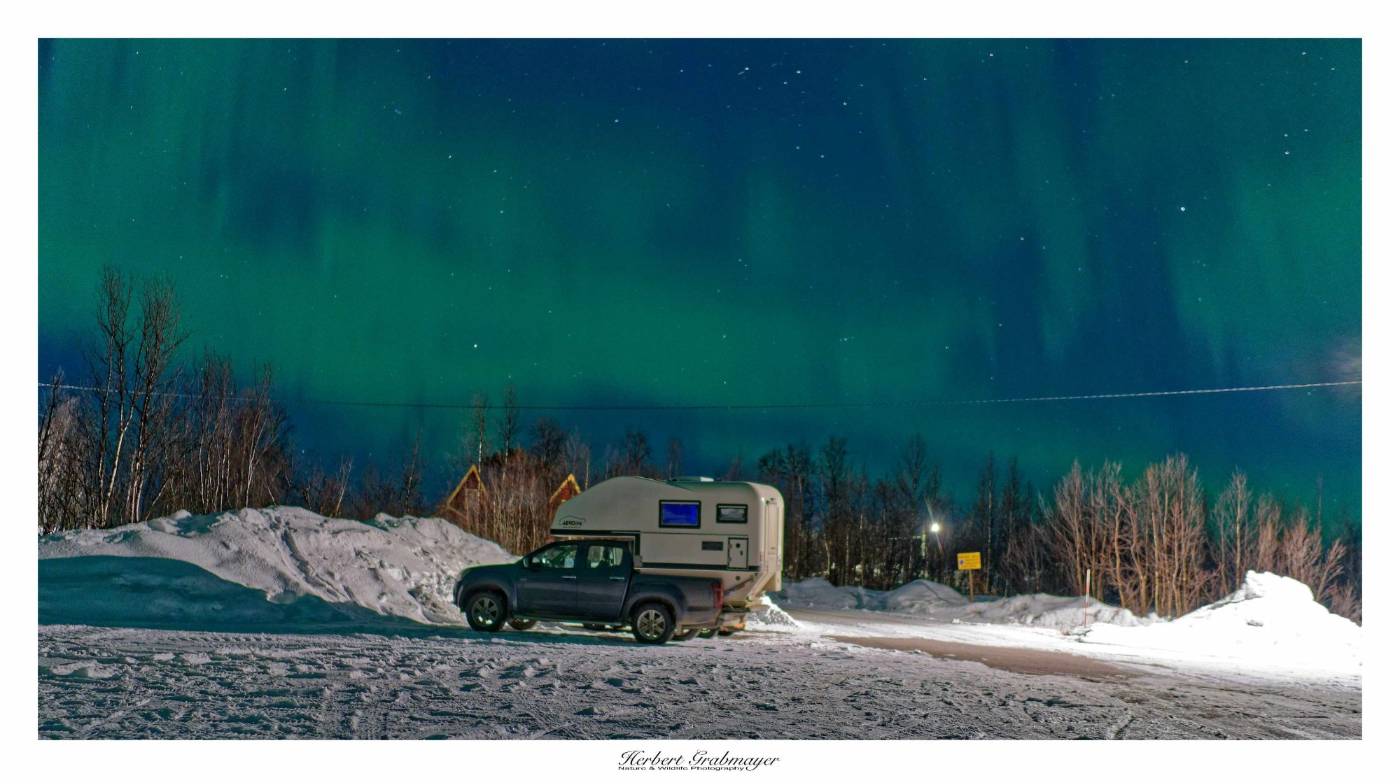 Abends wartete ich noch auf dem Aussichtspunkt beim Schilift auf die Polarlichter. War mir aber dann doch zu hell und ich fuhr noch 10 km zu einem kleinen Parkplatz. Der hatte dann die perfekte Ausleuchtung im Hintergrund. Heute sind mir wesentlich bessere Bilder gelungen. Allerdings waren die Polarlichter auch stärker als gestern.